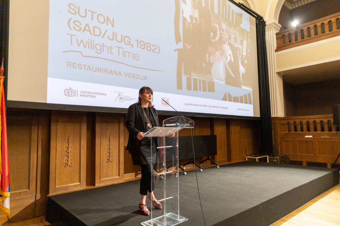 „Изузетно ми је драго што вечерас имам прилику да најавим премијеру дигитално рестаурисаног филма – Сутон (Twillight Тиме). Ово је пето филмско остварење Горана Паскаљевића које је дигитално рестаурисано у оквиру пројекта А1 Кинотека и веома је важно за српску културу и домаћи филм из више разлога. Српско-америчка копродукција, за коју је заслужан г. Ден Тана који је вечерас са нама, омогућила је једном од наших најистакнутијих редитеља, Горану Паскаљевићу, пробој изван граница Југославије“, изјавила је Ксенија Зеленовић, заменица директора Југословенске кинотеке која се обратила публици пред пројекцију филма и додала: „Специфичну важност овом филму даје и чувени Карл Малден, холивудски глумац српског порекла, овенчан Оскаром, чији легат чува Југословенска кинотека и чија статуа, која се налази на самом улазу у нашу зграду, представља један од симбола ове институције“.
