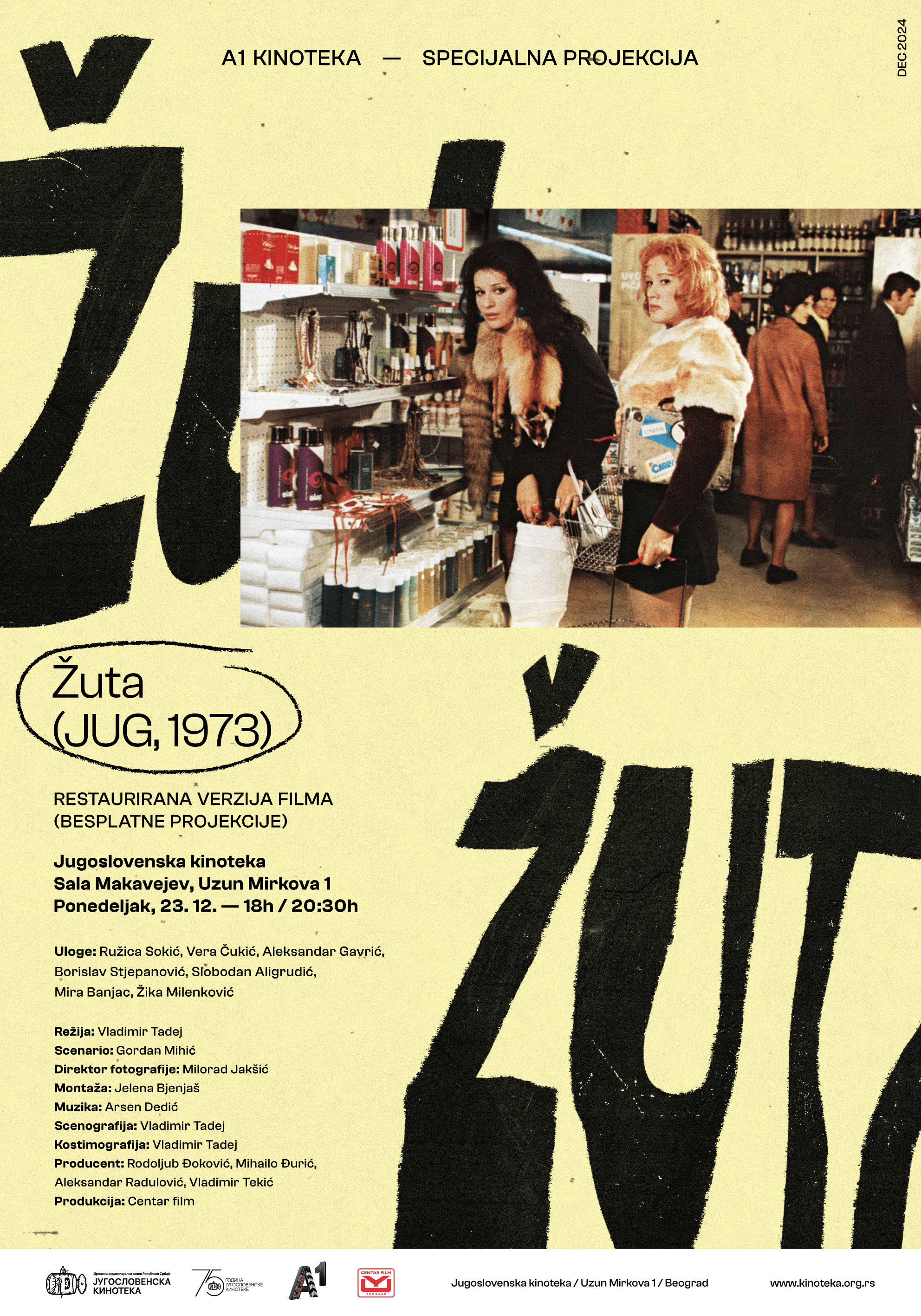 Дигитално рестаурирани филм „Жута“ (1973, Центар филм), редитеља Владимира Тадеја, а по сценарију Гордана Михића, биће бесплатно приказан за публику у Југословенској кинотеци у Узун Мирковој улици, у понeдељак 23. децембра у два термина – у 18.00 и 20:30 часова. Ово је 36 филм који је дигитално рестауриран у оквиру пројекта А1 Кинотека.