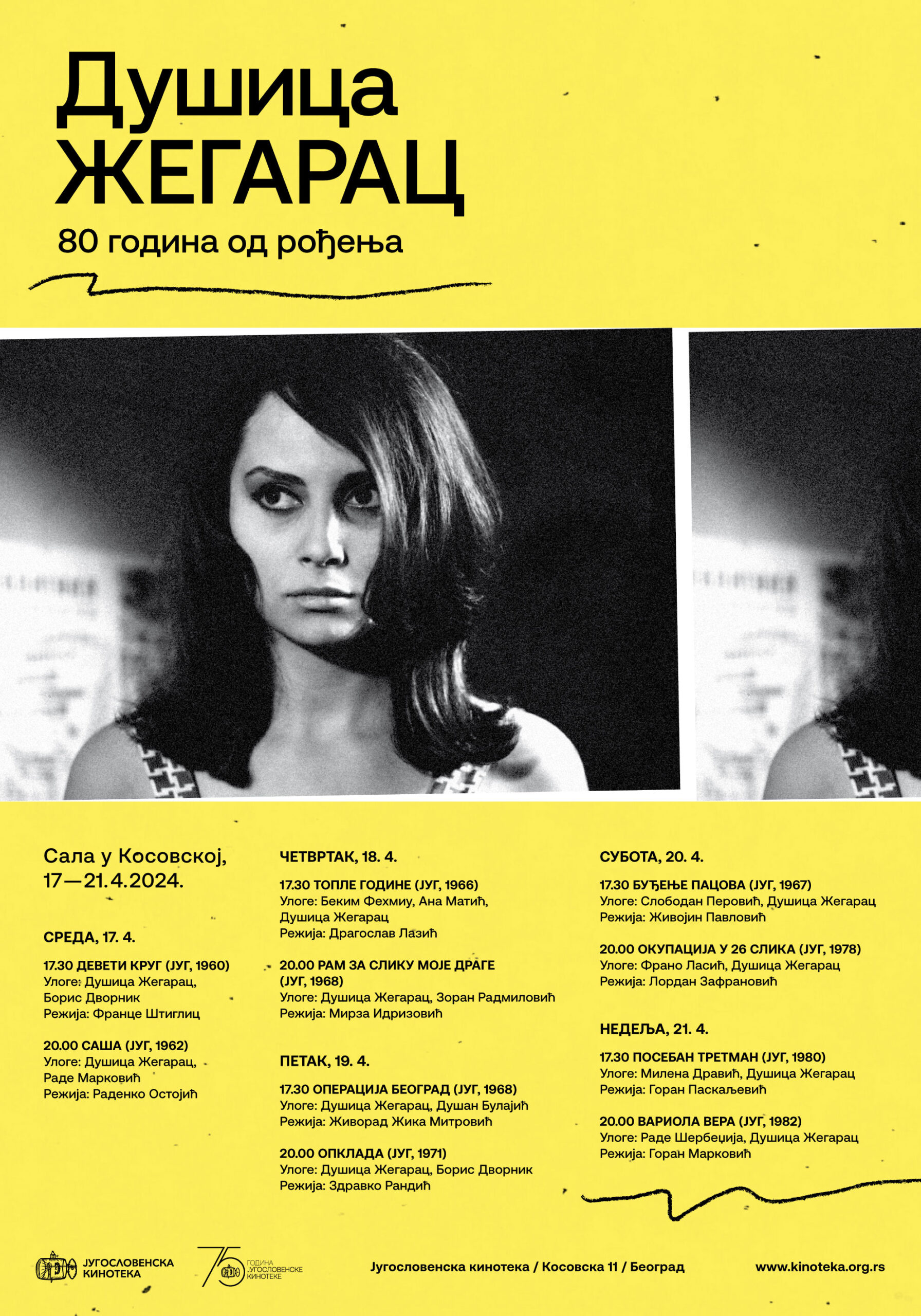 Југословенска кинотека обележава 80 година од рођења звезде српске и југословенске кинематографије Душице Жегарац (1944-2019) циклусом њених филмова који ће бити приказан од 17. до 21. априла у сали у Косовској улици.