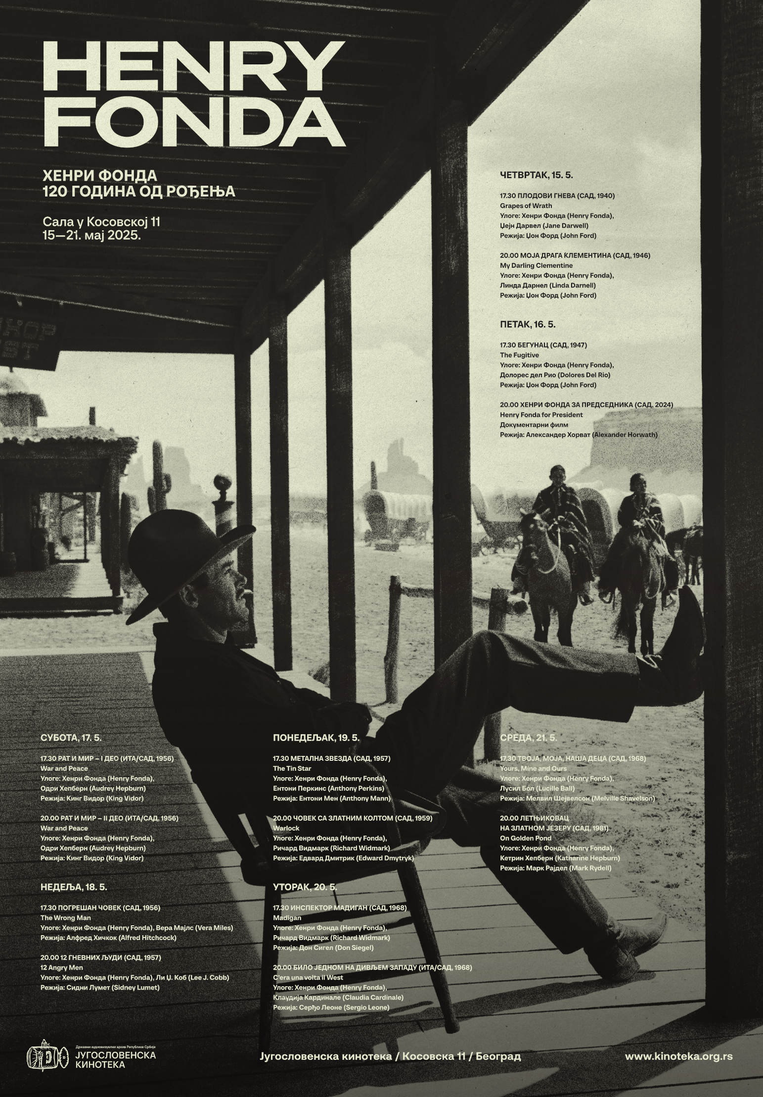 Један од најзначајнијих глумаца „златног доба Холивуда“, оскаровац Хенри Фонда (1905-1982), чији филмски и телевизијски опус броји чак 127 наслова, рођен је пре тачно 120 година, 16. маја 1905. у америчкој држави Небраска. У Југословенској кинотеци се тим поводом приказује циклус његових филмова, од 15. до 21. маја у сали у Косовској улици.