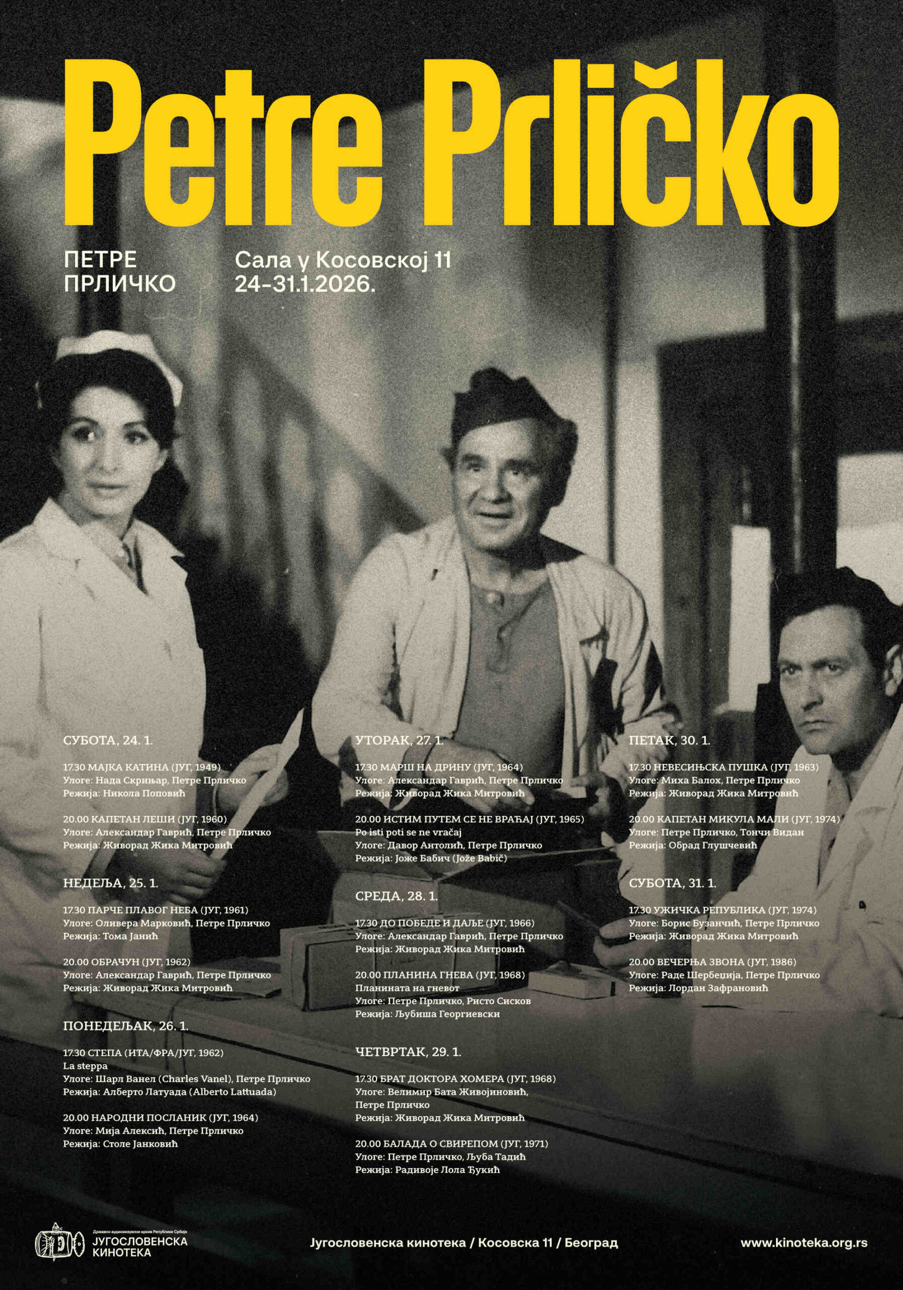 Југословенска кинотека од 24. до 31. јануара у сали у Косовској улици приказује филмове у којима је играо Петре Прличко (1907-1995), најпознатији македонски глумац у доба југословенске кинематографије.