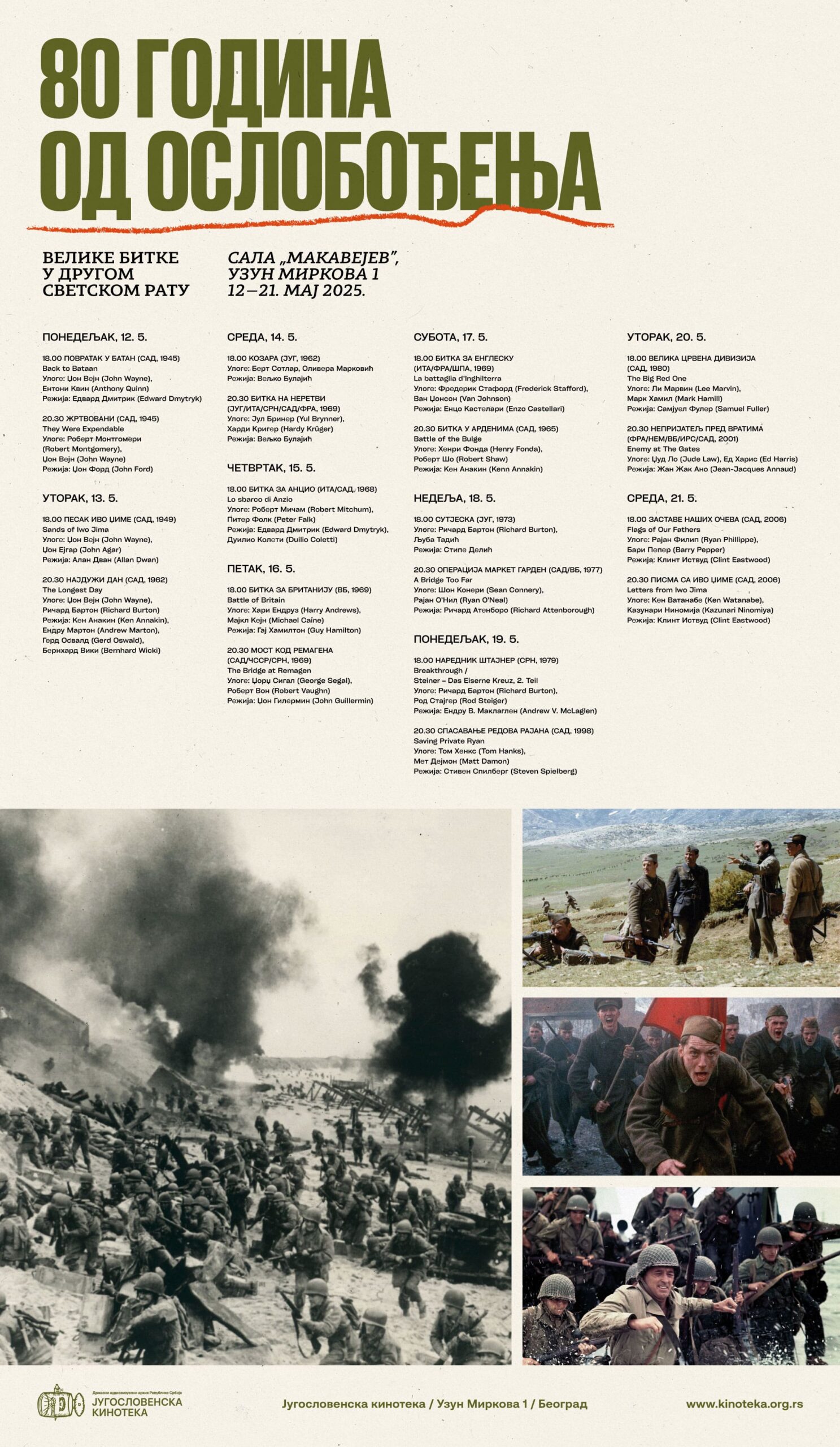 Југословенска кинотека је приредила циклус „Велике битке у Другом светском рату“ поводом 80 година од ослобођења, односно завршетка страшног сукоба који је убрзо постао честа тема светске кинематографије.