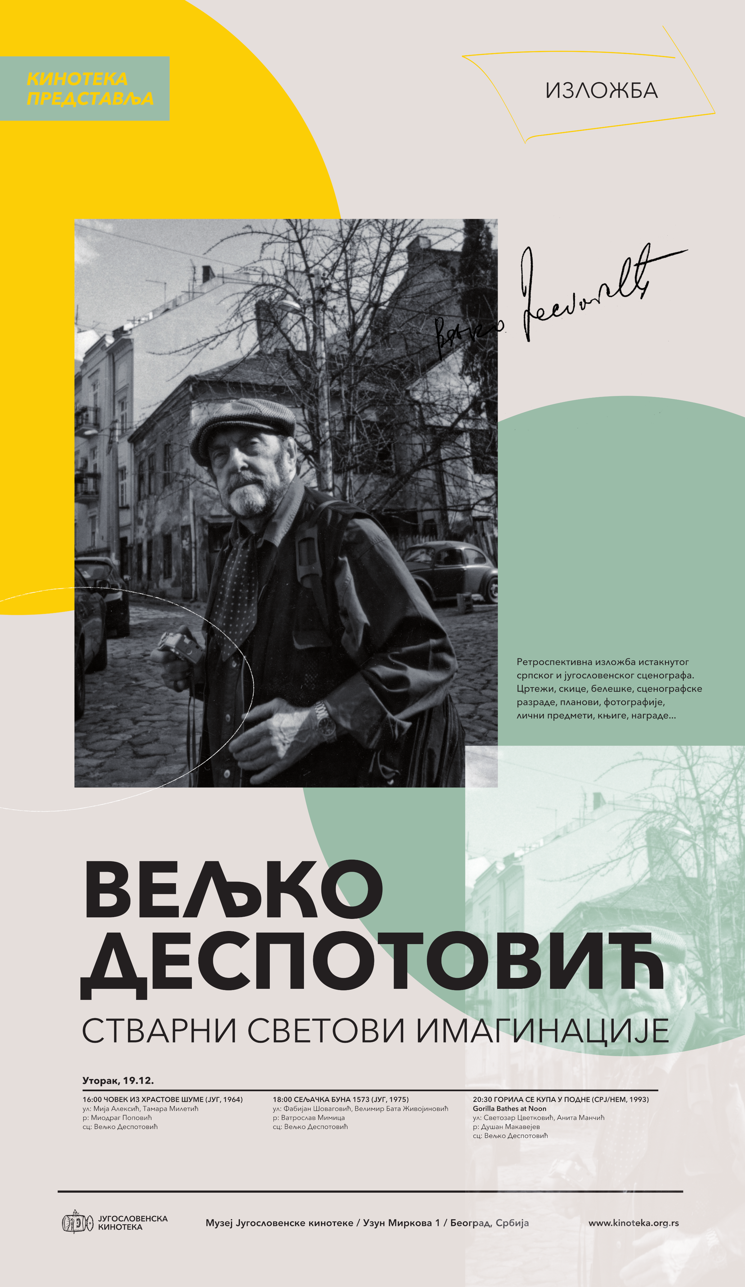 Ретроспективна изложба у част истакнутог српског и југословенског филмског сценографа Вељка Деспотовића (1931-2013) биће отворена 18. децембра у 18 сати у централном фоајеу Југословенске кинотеке.