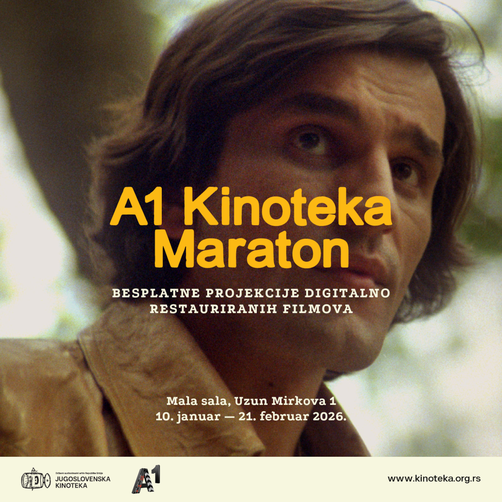 Специјални програм под називом „А1 Кинотека маратон“ биће одржан у малој сали у згради у Узун Мирковој улици од 10. јануара до 21. фебруара, сваке вечери од 19 сати. На бесплатним пројекцијама приказују се дигитално рестаурисани домаћи филмови. Оригиналну слику и тон вратили су им стручњаци у Одељењу за дигиталну рестаурацију Архива кинотеке, у оквиру великог пројекта А1 Кинотека који је до сада обухватио 41 филм из друге половине 20. века.