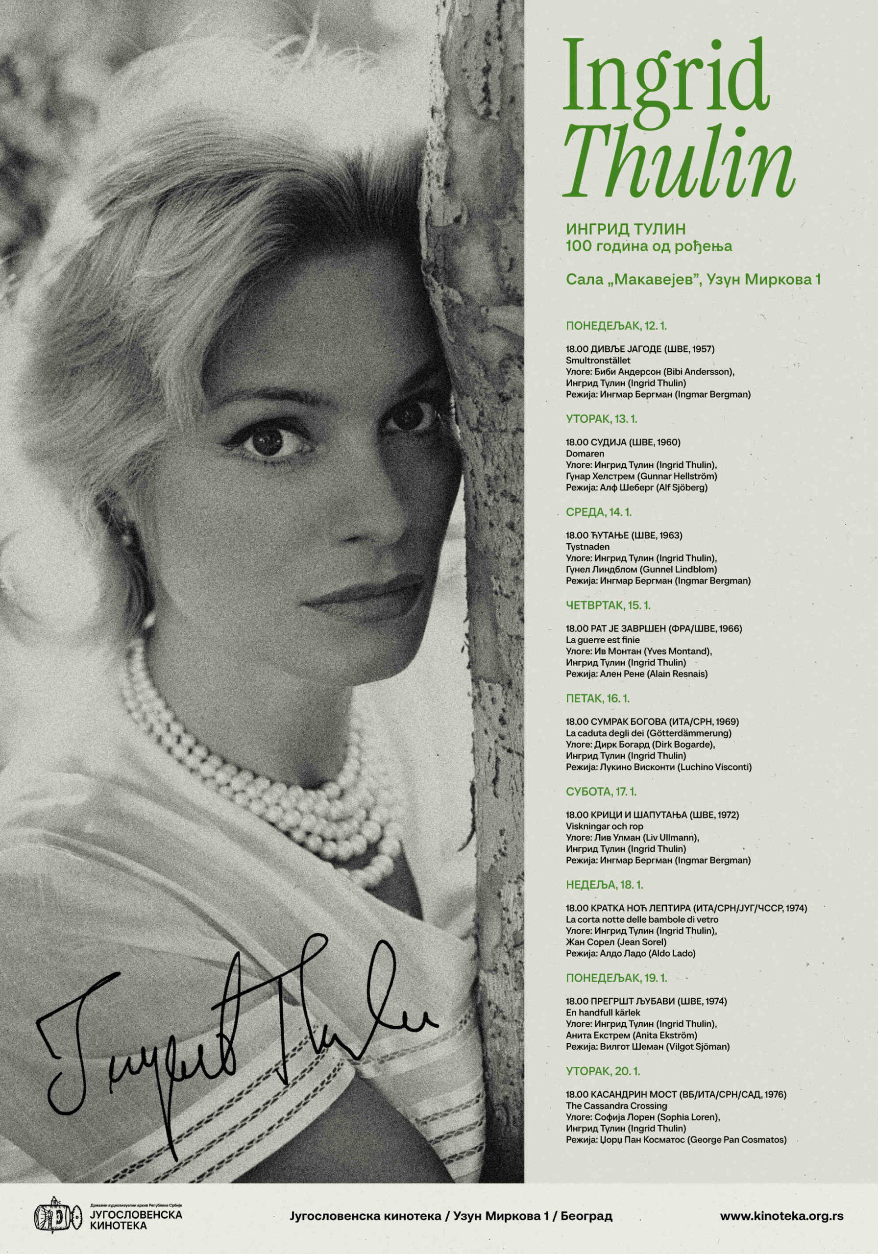 Поводом сто година од рођења шведске глумице Ингрид Тулин од 12. до 20. јануара биће приказан избор из њеног опуса, који започиње филмом „Дивље јагоде“ (1957) великана светске кинематографије Ингмара Бергмана. Наредних дана у термину од 18 сати моћи ће да се виде и други Бергманови филмови у којима је играла Ингрид Тулин, али и њене улоге у европским копродукцијама као што су „Рат је завршен“ (1966) Алена Ренеа, „Сумрак богова“ (1969) Лукина Висконтија…