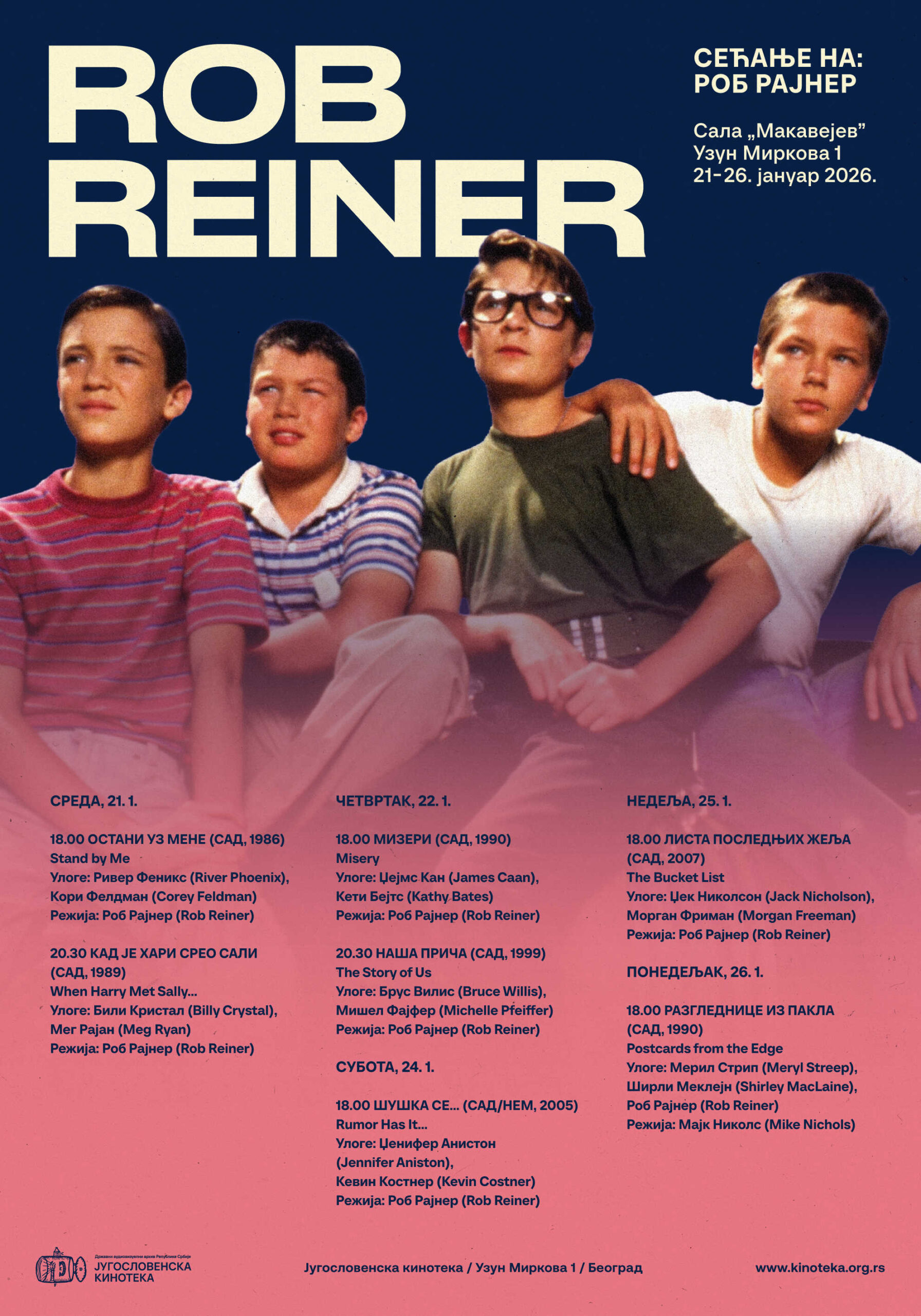 Програм Сећање на од 21. до 26. јануара приказује филмове трагично настрадалог америчког редитеља, сценаристе и глумца Роба Рајнера. У овај циклус укључени су култни филм одрастања „Остани уз мене“ (1986), једна од најпознатијих љубавних комедија „Кад је Хари срео Сали“ (1989), психолошки трилер „Мизери“ (1990), комедија и драма о (не)успелом браку „Наша прича“ (1999) и други филмови у режији Рајнера, а као глумца публика Кинотеке моћи ће да га види у црној комедији „Разгледнице из пакла“ (1990) Мајка Николса, уз Мерил Стрип и Ширли Меклејн.