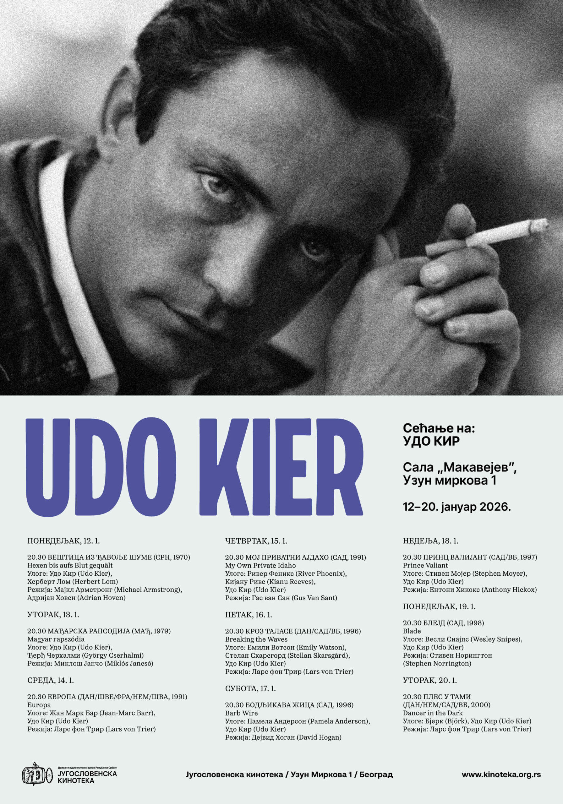 Пројекције у сали Кинотеке у Косовској улици у 2026. години почињу 3. јануара са два филма америчког редитеља Роберта Сиодмака. На 80 година од премијере приказује се његов филм ноар и психолошки трилер „Тамно огледало“ (1946), према сценарију француског уметника Владимира Познера који је био номинован за Оскара. Следи вестерн „Кастер са Запада“ (1966), у којем је насловног генерала играо Роберт Шо, а премијера је била пре 60 година.