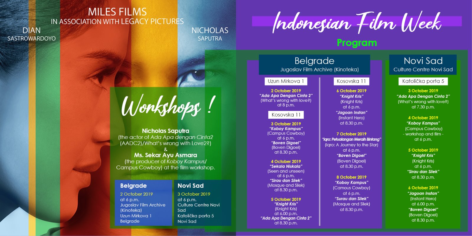 Недеља индонежанског филма свечано је почела 2. октобра у Југословенској кинотеци пројекцијом филма „Шта се десило са љубављу? 2“ (2016) редитеља Ририја Ризе, у присуству једног од главних глумаца и првог и другог дела те романтичне комедије и драме Николаса Сапутре.