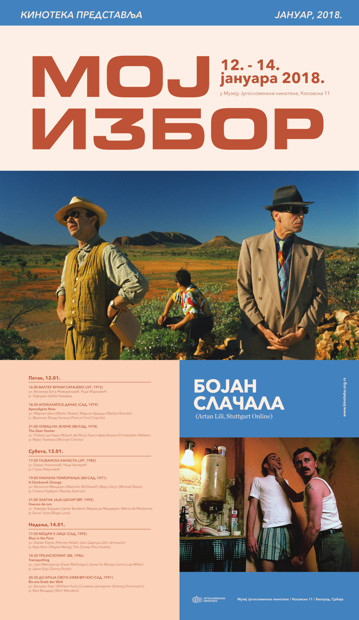 Стални програм Мој избор за овај месец саставио је Бојан Слачала, гитариста, певач, аутор видео-спотова, ликовни уметник, оснивач бендова Artan Lili и Stuttgart Online. У интервјуу за Кинотеку каже да је филмове бирао на основу импулса и емоција, да код старих мајстора цени дух, стил и шарм, а пре свега добру причу, али и да без јаке и упечатљиве музичке теме нема великог филма, што се у домаћој кинематографији, према његовој оцени, не схвата у довољној мери.