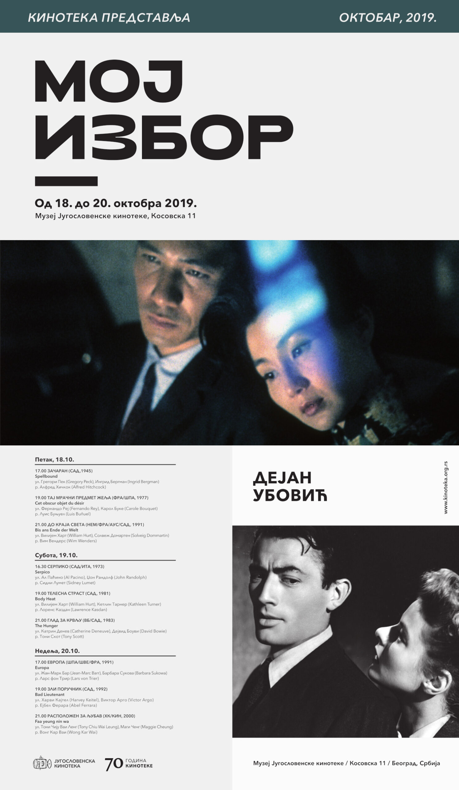 Директор Културног центра Град Дејан Убовић открио је у интервјуу за Кинотеку да је још као основац водио „филмски дневник” и да је и даље очаран одласком у мрак биоскопа. Листу за програм Мој избор описао је као скуп филмова о позитивним отпадницима и чудним карактерима с маргине, а нит која их повезује јесте љубав или потрага за срећом. За Убовића Фест је уметничка слава, телевизијске серије не прати, док програмима Кинотеке даје оцену пет плус.