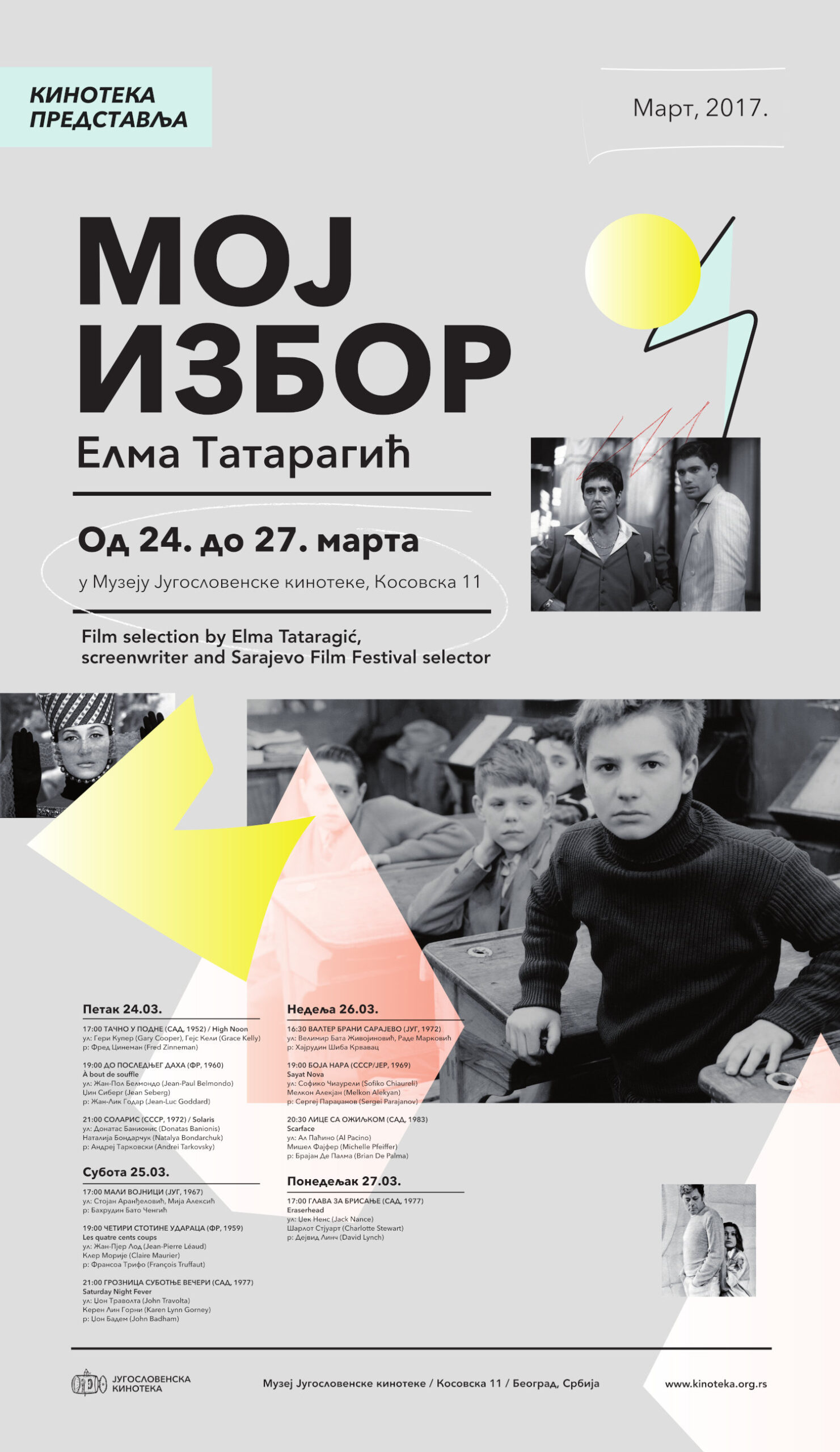Сценаристкиња, продуценткиња и редитељка Елма Татарагић из Сарајева уврстила је у мартовски програм Кинотеке „Мој избор” десет филмова које би, како каже, волела да види с колегама и пријатељима у биоскопу јер сматра да нема лепшег искуства него гледати филм на великом платну, у мраку и тишини. За часопис „Кинотека” говорила је о омиљеним ауторима, времену када је упознавала покретне слике, али и о актуелном стању продукције у Босни и региону, као и о својим новим пројектима.