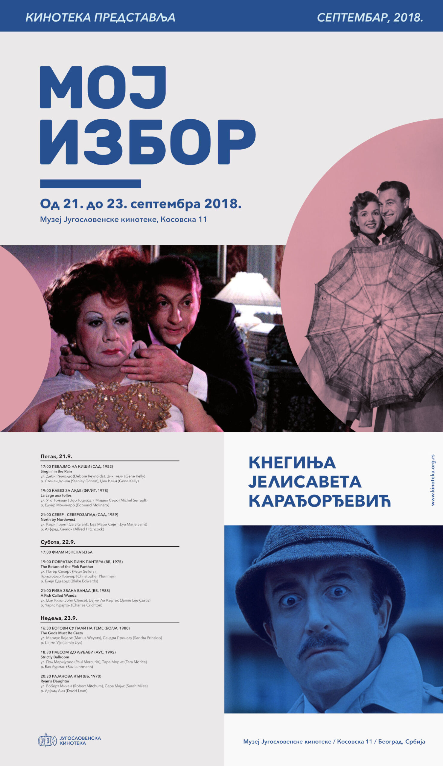 За септембарски програм „Мој избор” филмове је одабрала кнегиња Јелисавета Карађорђевић. На њеној листи преовлађују комедије, али има и романси, драма, авантура из раздобља од педесетих до деведесетих година прошлог века. У интервјуу за часопис Кинотека кнегиња је говорила и о томе шта је највише привлачи одређеном делу, како је формирала филмски укус, које је место седме уметности у данашњој култури.
