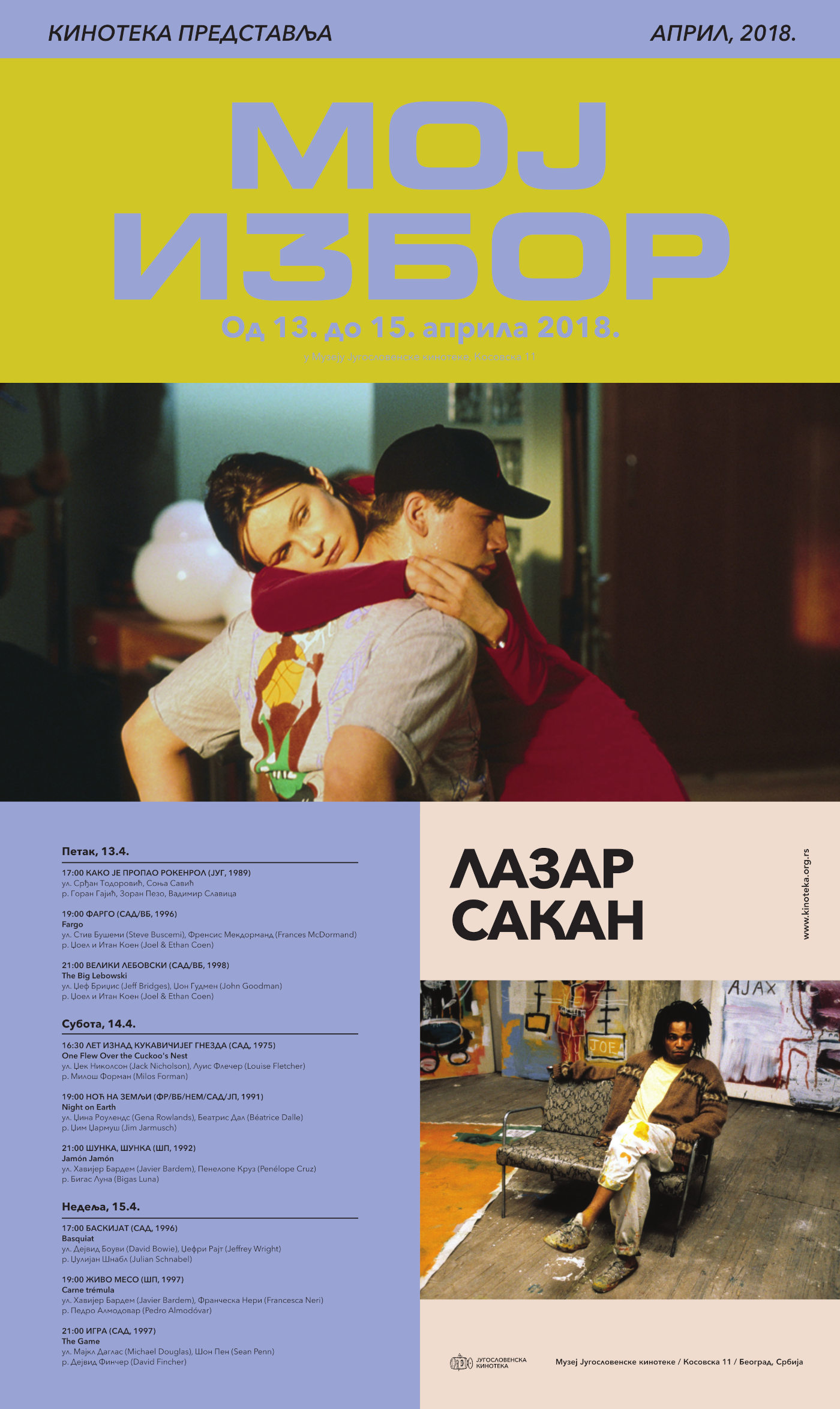Програм сталног циклуса Кинотеке „Мој избор” за април је саставио креативни менаџер агенције „Њу момент” Лазар Сакан. На његовој листи су филмови специфичне поетике које описује као ишчашене и као оне који су у њему пробудили неку емоцију. У интервјуу за наш часопис Сакан истиче да би га интересовала кампања за већу посету домаћим биоскопима, а коментарише и начин гледања филмова у Америци.