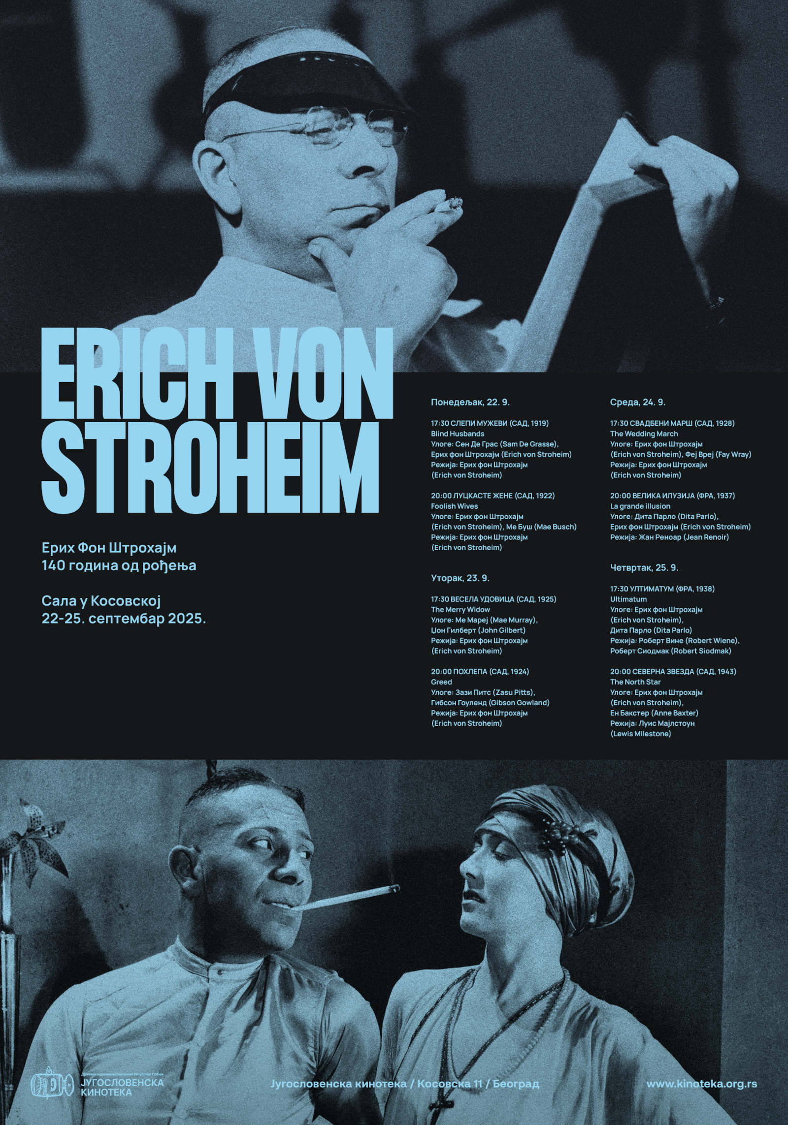 Циклус поводом 140 година од рођења славног редитеља из доба немог филма Ериха фон Штрохајма (1885-1957) биће приказан у Југословенској кинотеци од 22. до 25. септембра у сали у Косовској улици.