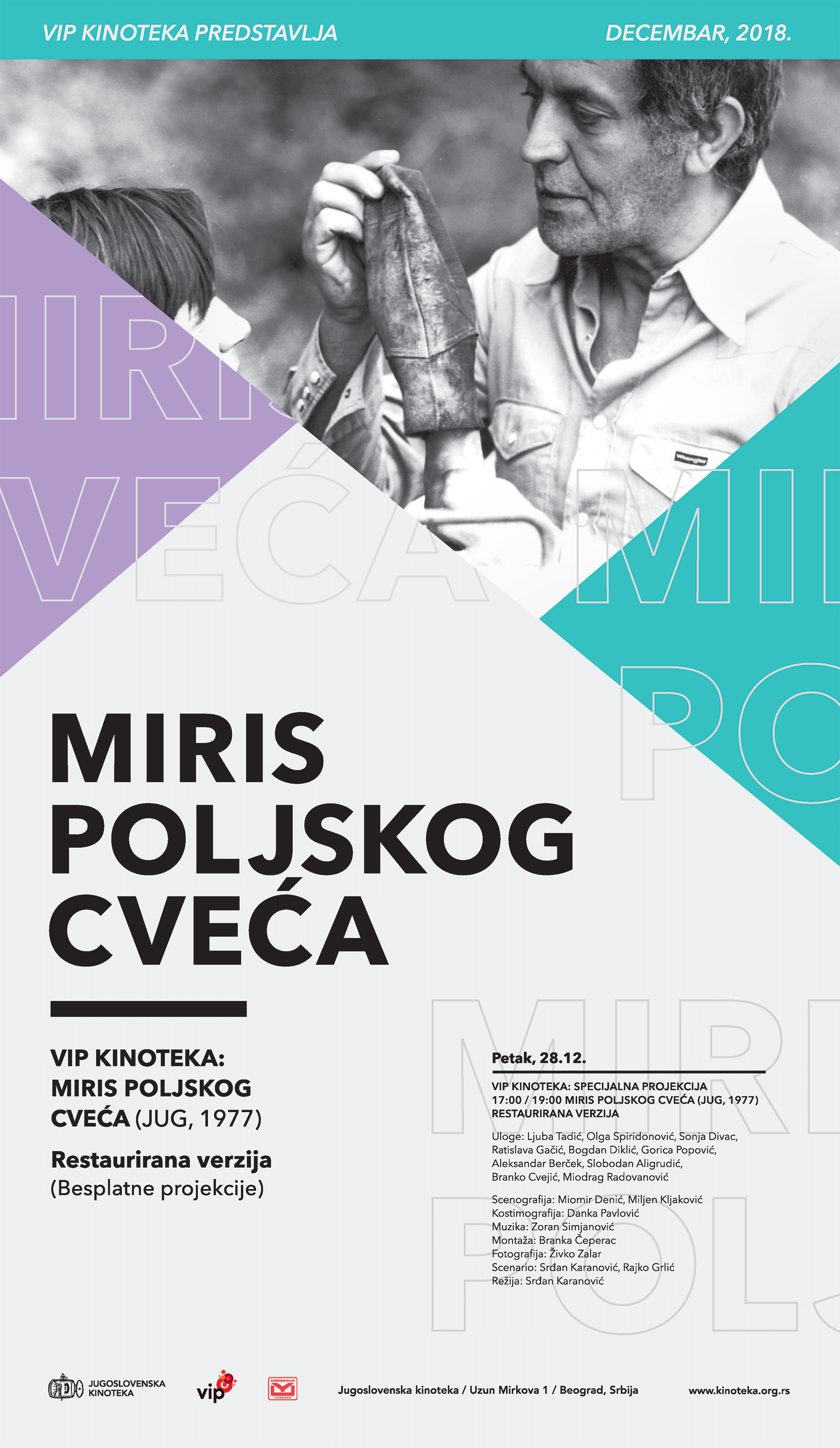 У оквиру пројекта Vip Кинотека дигитално је рестауриран још један од антологијских филмова српске кинематографије – „Мирис пољског цвећа“ Срђана Карановића, који је, заједно са неколико чланова екипе тог остварења из 1977. године, присуствовао поновној премијери 27. децембра у свечаној сали Југословенске кинотеке.