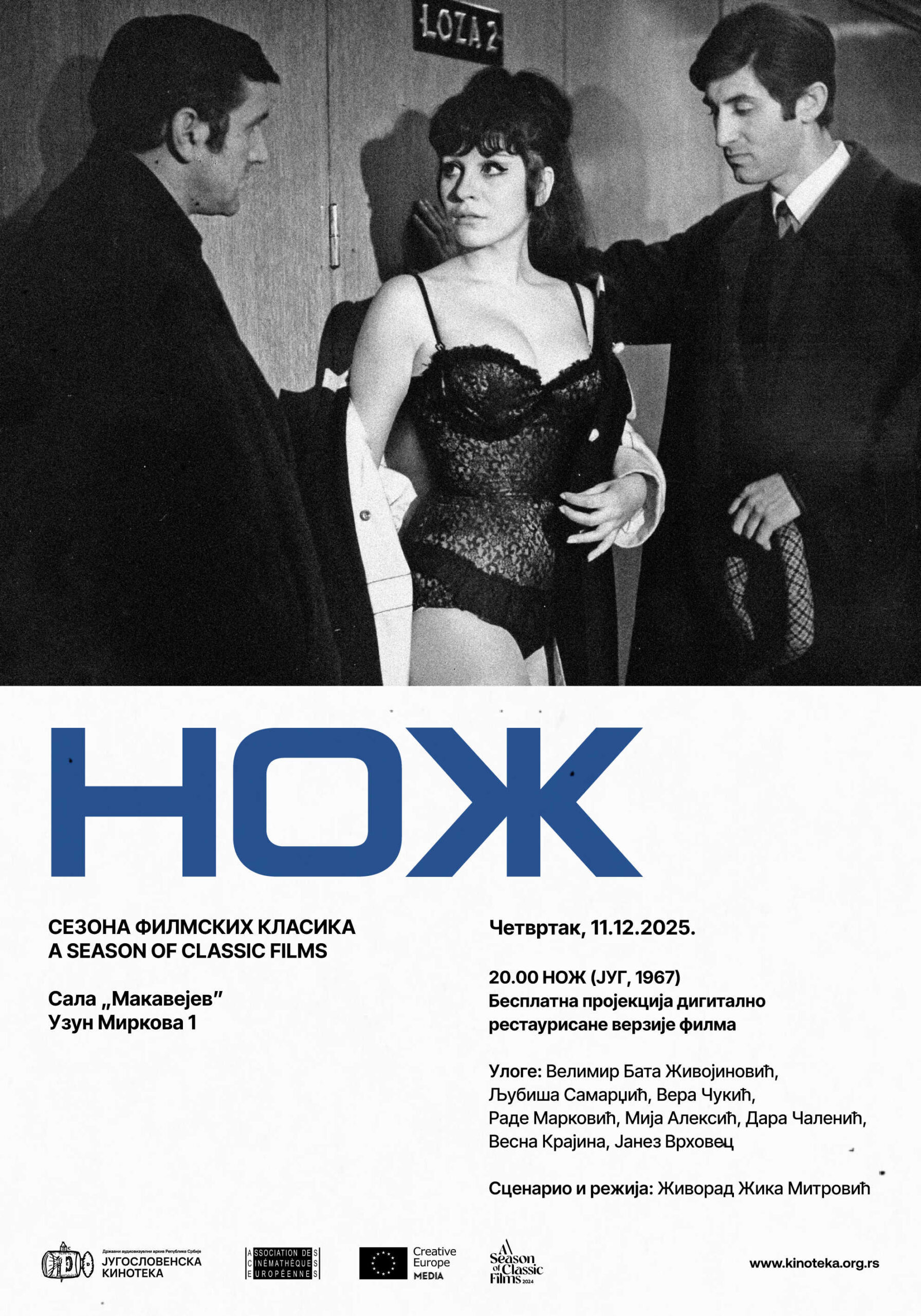 За Југословенску кинотеку је 2025. година била у знаку Жике Митровића. Почетком године је приређена велика ретроспектива његових филмова, да би одмах потом публици била представљена рестаурисана верзија његовог филма „Убиство на подмукао и свиреп начин и из ниских побуда“ (1969), у оквиру пројекта А1 Кинотека. Такође, поводом обележавања 150 година Херцеговачког устанка, Кинотека је организовала свечану пројекцију филма „Невесињска пушка“ (1963), ређе приказиваног наслова из Митровићевог опуса. Рестаурацијом филма „Нож“, Југословенска кинотека заокружује годину посвећену овом аутору.