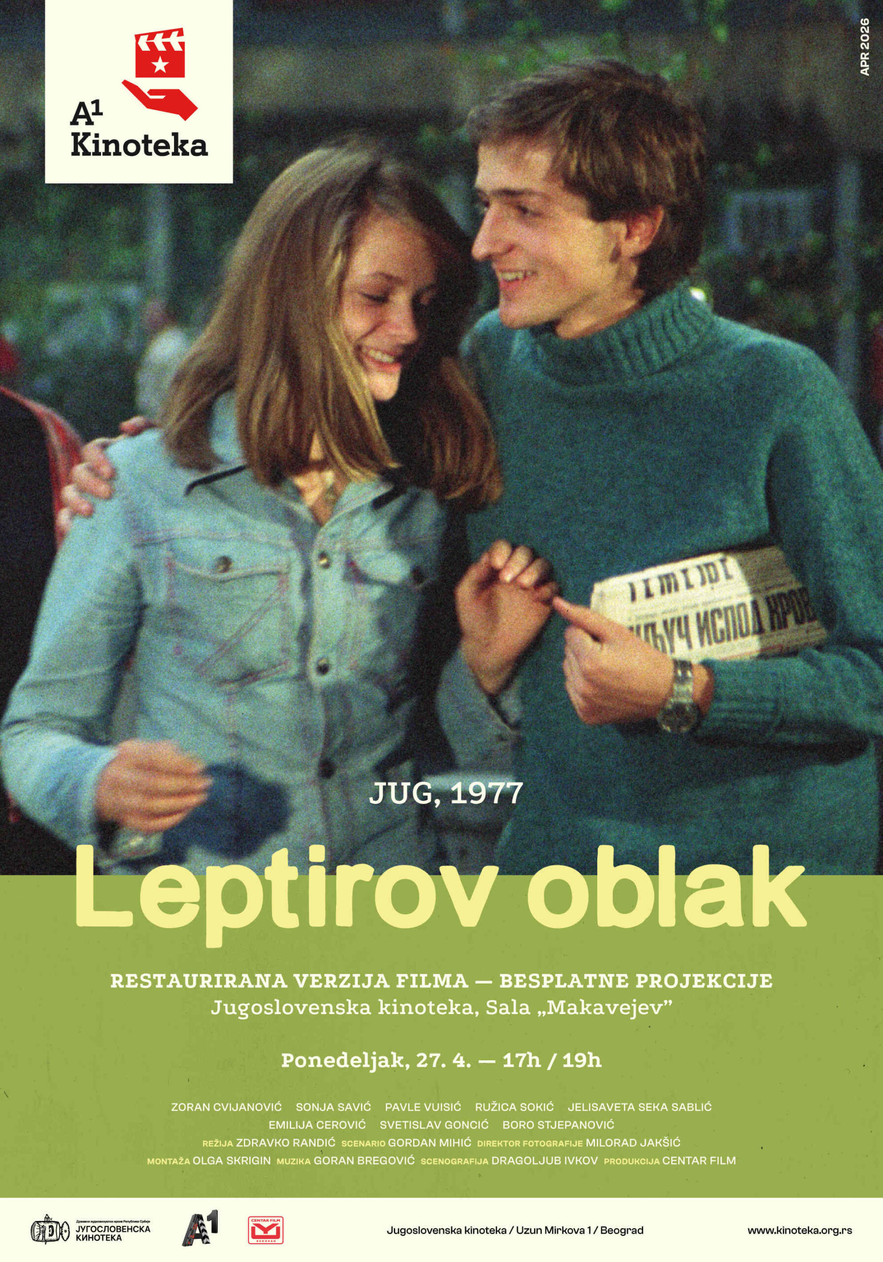 У оквиру пројекта А1 Кинотека 27. априла биће одржане две бесплатне пројекције дигитално рестаурисане копије домаћег филма „Лептиров облак“ (1977) Здравка Рандића. Крај детињства, прва љубав, неспоразуми који изгледају нерешиви, судбински покрећу сетно-комичну причу о шеснаестогодишњем дечаку. У овој тинејџерској комедији, према сценарију Гордана Михића, главну улогу играо је Зоран Цвијановић, његове родитеље Павле Вуисић и Сека Саблић, а прву љубав Соња Савић.