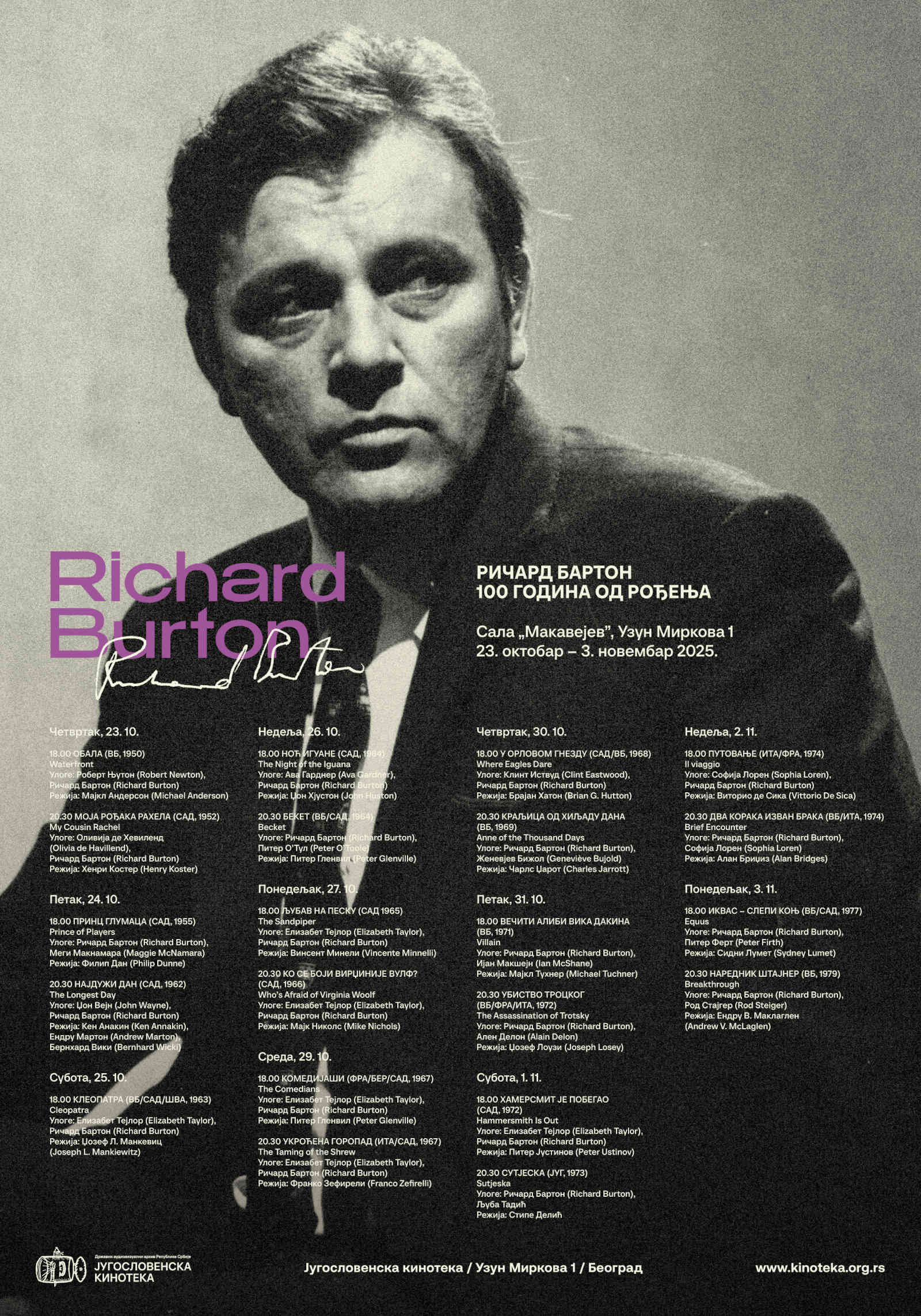Великан светског филма, британски глумац Ричард Бартон, рођен је пре тачно сто година, а тим поводом Југословенска кинотека приказује ретроспективу његових филмова у сали „Макавејев“ од 23. октобра до 3. новембра.