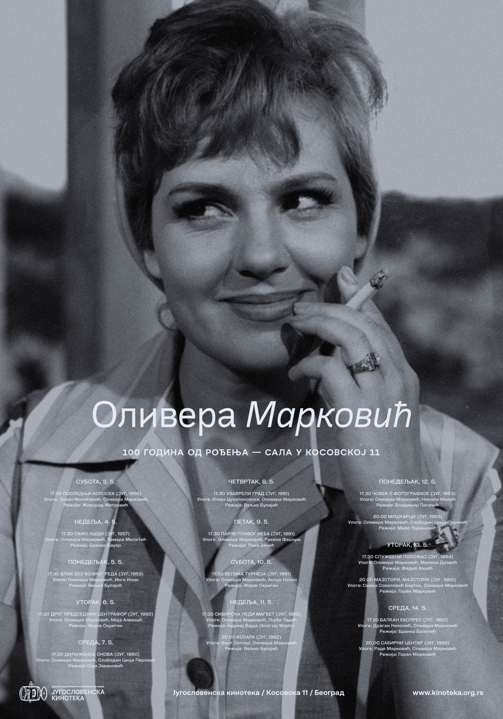 Пре тачно сто година – 3. маја 1925. рођена је велика српска и југословенска глумица Оливера Марковић. Тог датума ове године у сали Југословенске кинотеке у Косовској улици почиње ретроспектива филмског опуса вољене и цењене уметнице, која је значајну каријеру остварила и на позоришним сценама и телевизији.