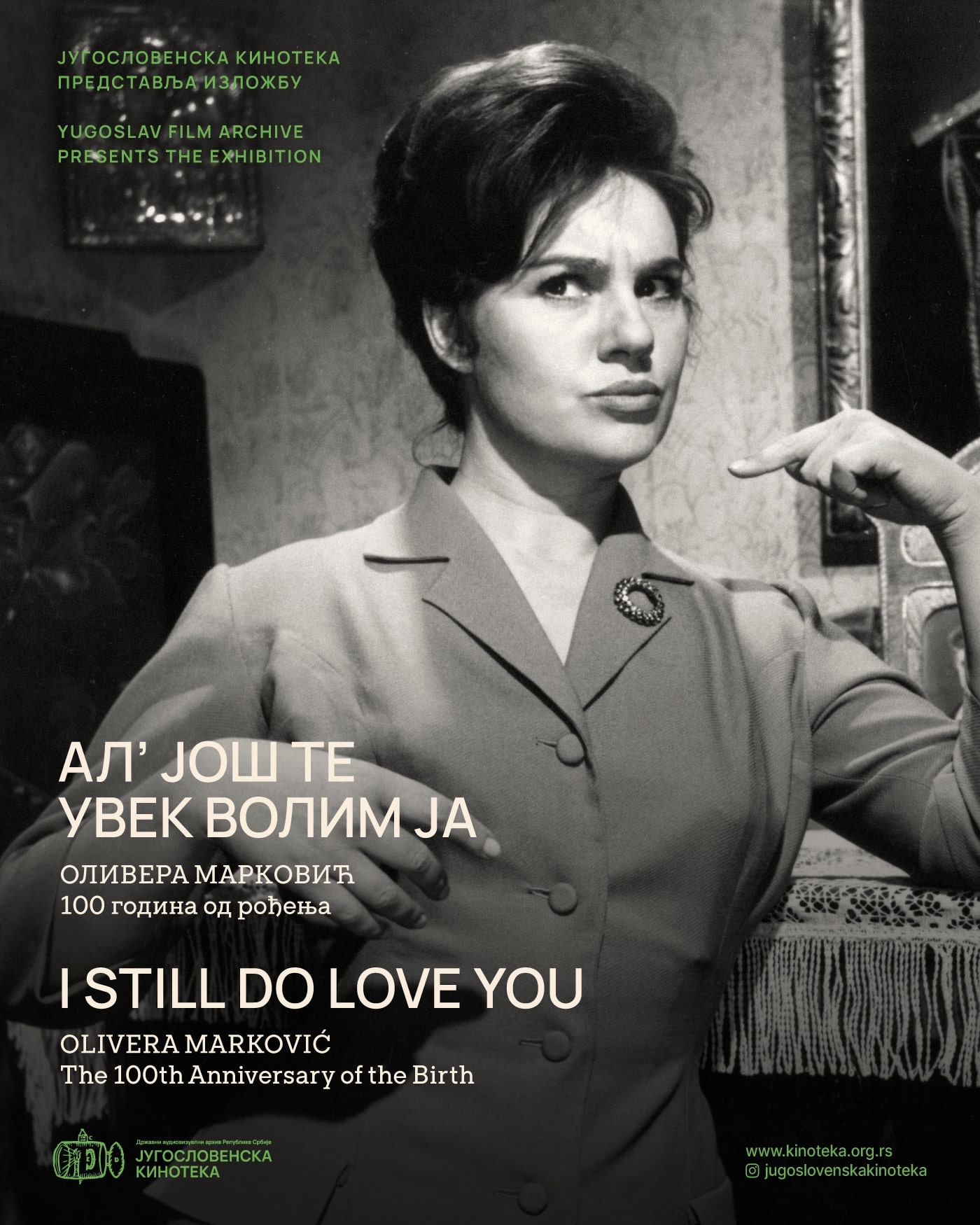 Од 3. до 10. маја филмови ће се приказивати у термину од 17.30 сати, а од 11. до 14. маја у два термина дневно – у 17.30 и у 20 сати. Посетиоци Кинотеке имаће прилику и да обиђу и пратећу изложбу у Узун Мирковој 1, с великим бројем фотографија које дочаравају Оливерину богату каријеру. Назив поставке „Ал’ још те увек волим ја“ подсећа да је била популарна и као певачица романси и староградских шлагера.