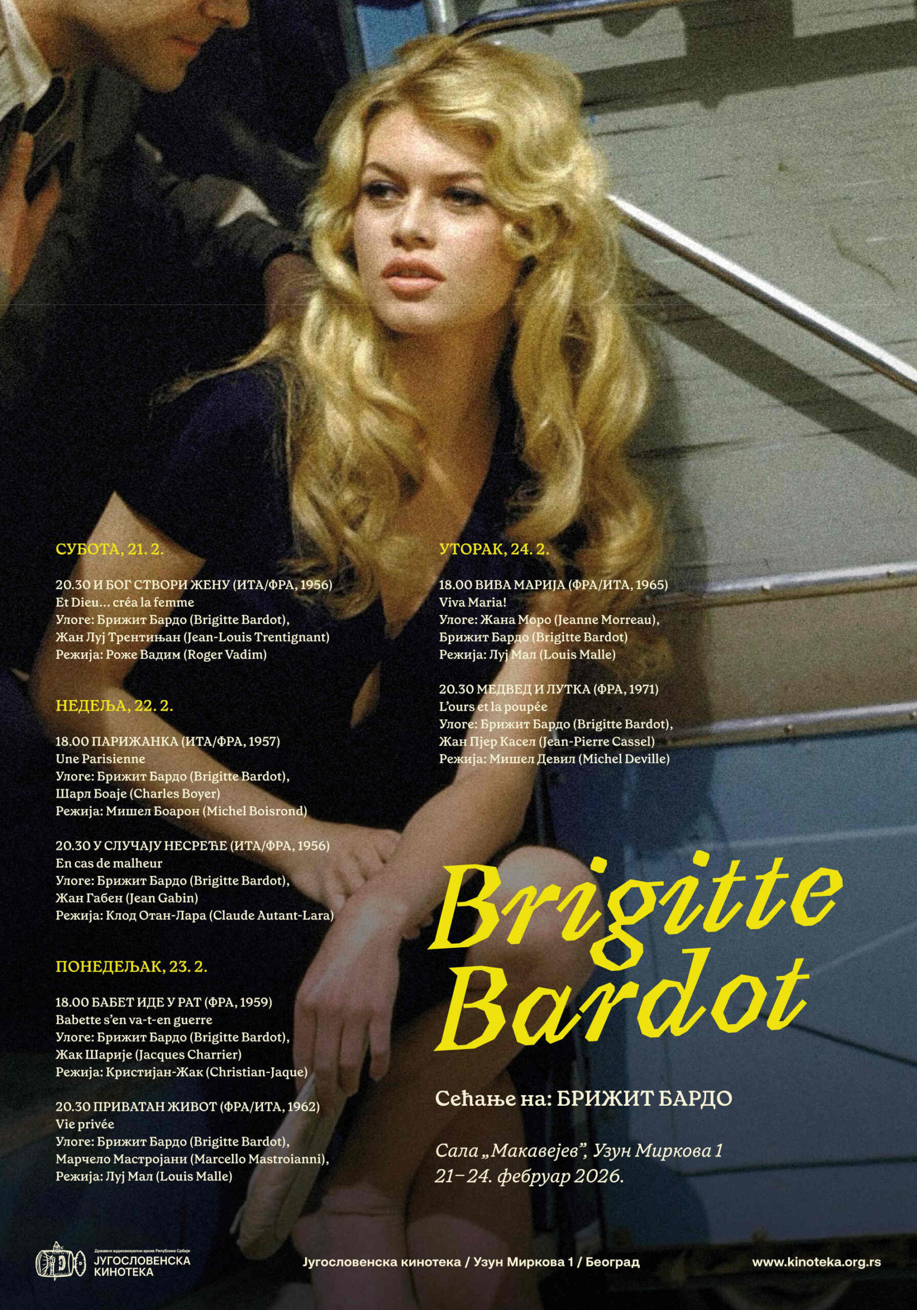 Циклус филмова Брижит Бардо (1934-2025) биће приказан у Југословенској кинотеци од 21. до 24. фебруара, поводом недавне смрти славне француске глумице која је својом лепотом и сексепилом обележила кинематографију и популарну културу 50-их и 60-их година 20. века.