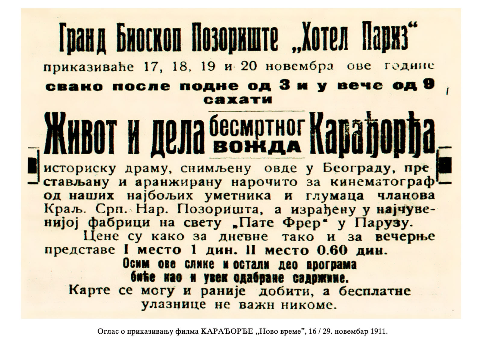 Званично први српски дугометражни играни филм „Карађорђе“ с обзиром на своје место у историји наше кинематографије и теме коју обрађује носи посебну тежину и симболику. Снимљен је и приказан у Београду 1911. године, а прича о његовом настанку, нестанку и поновном проналаску, интересантна је толико да би се и о њој могао снимити филм.