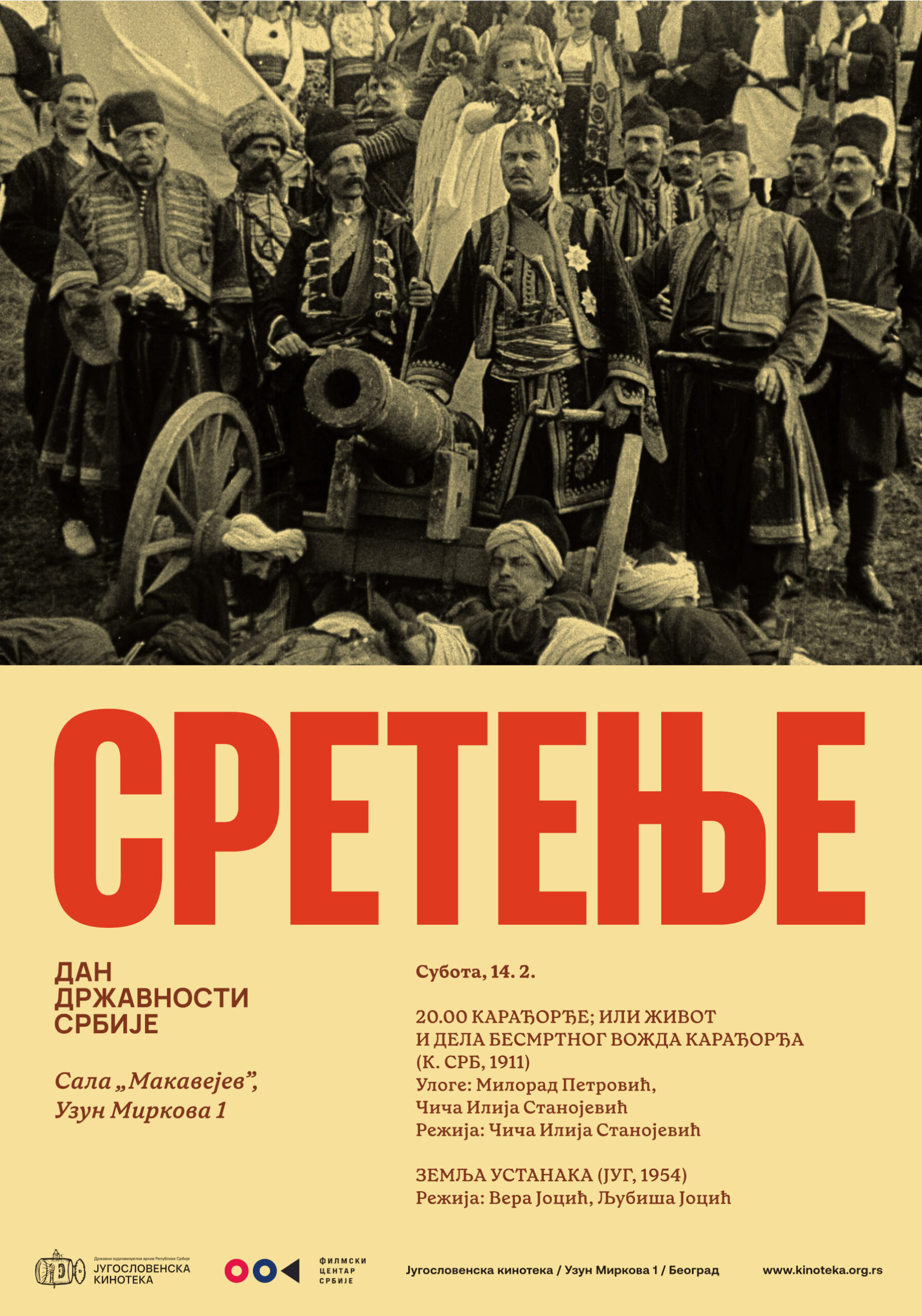 Државни аудиовизуелни архив Србије Југословенска кинотека, у сарадњи с Филмским центром Србије, поводом обележавања Дана државности Србије, приказаће 14. фебруара на свечаној пројекцији два филма која се баве темом Првог српског устанка и личношћу вожда Карађорђа. То су играни филм „Карађорђе; или живот и дела бесмртног вожда Карађорђа“ (1911), у режији Илије Станојевића и документарни „Земља устанака“ (1954), у режији Љубише и Вере Јоцић.