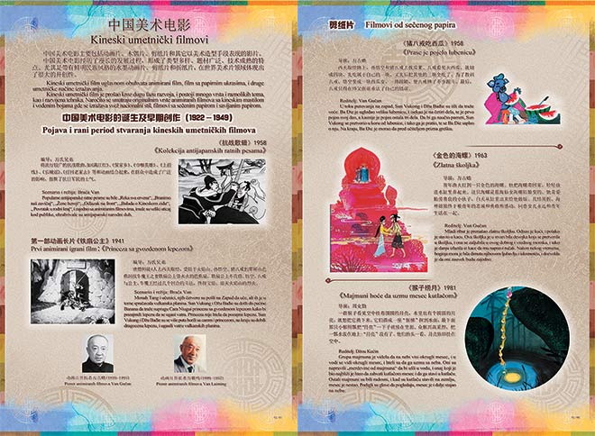 Изложба „112 година кинеског филма”, ауторке Ванг Хунхуе, подељена је у две велике целине: први део представља историјат кинеског филма, а други је омаж партизанским филмовима из бивше Југославије.