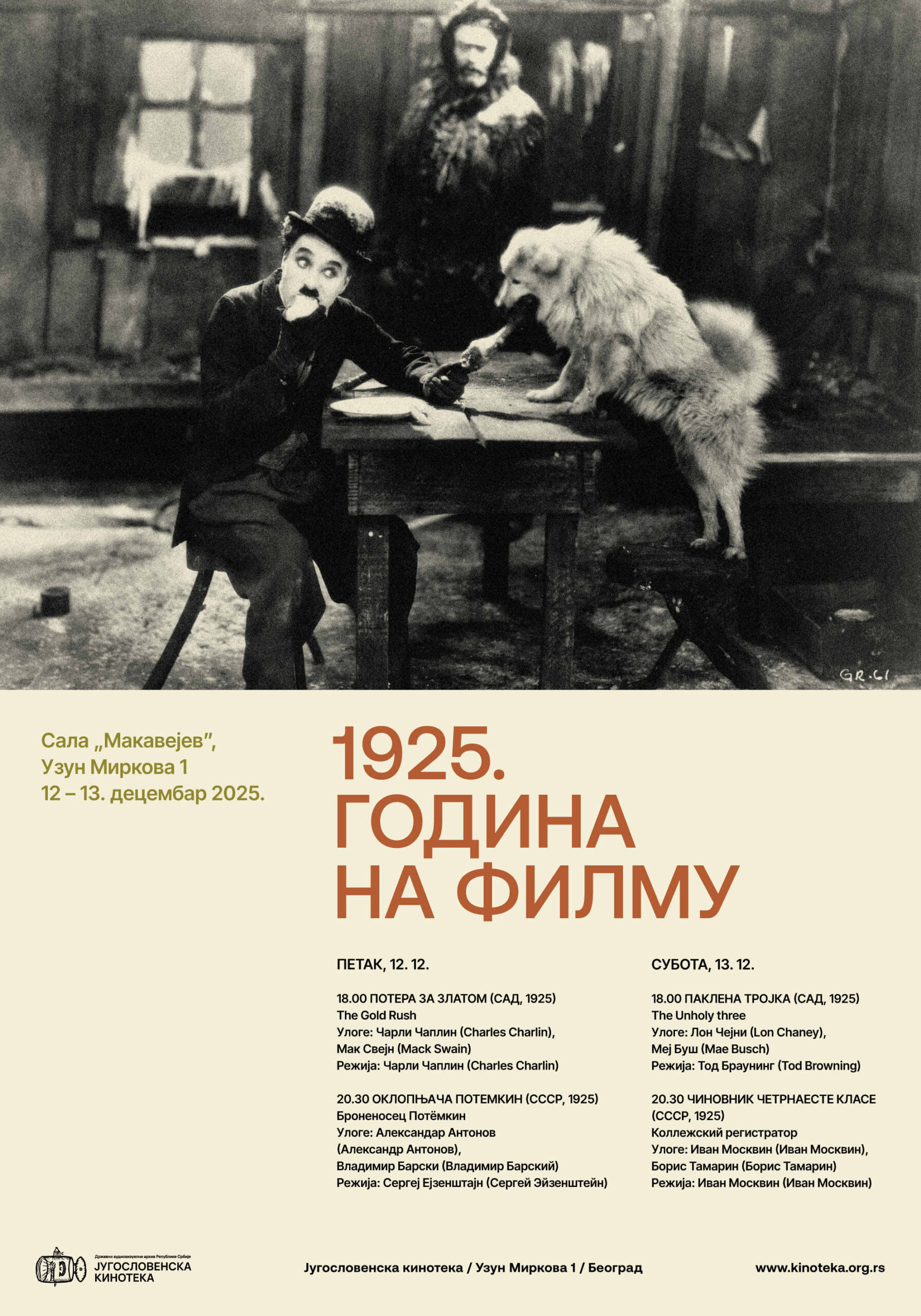Два америчка и два совјетска филма снимљена пре сто година, међу којима су славна остварења Чаплина и Ејзенштајна, затвориће 12. и 13. децембра циклус „1925. година на филму“, који је осмислио Александар Ердељановић и започео га прошле, 2024. године, циклусом „1924. година на филму“.